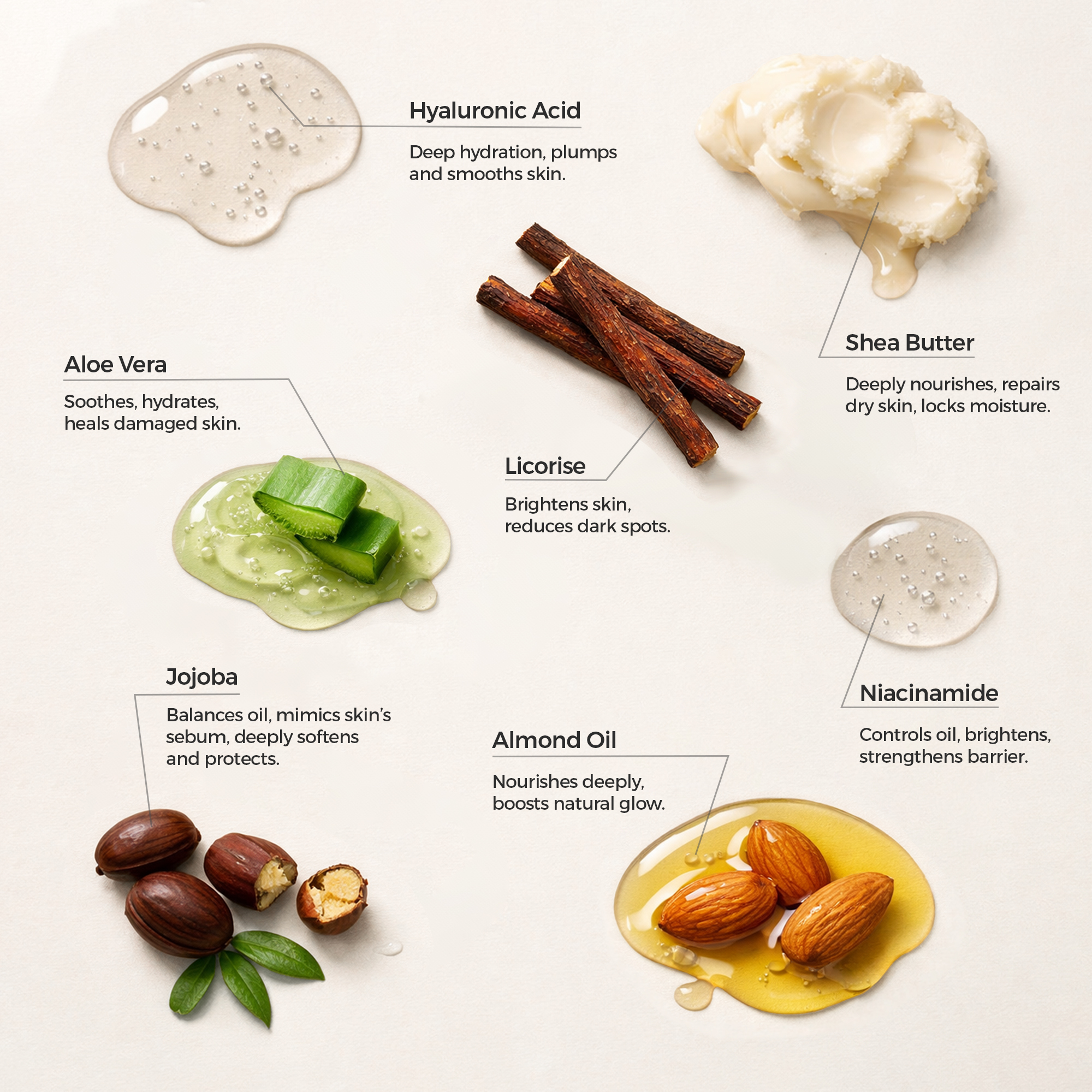 Hyaluronic Acid – Deeply hydrates and plumps the skin.